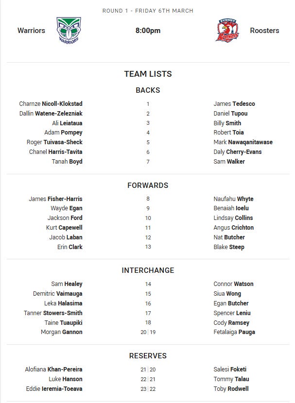 The Warriors’ 19-man squad for the Round 1 clash with Sydney Roosters rolled out more or less as expected, with winger Roger Tuivasa-Sheck and five-eighth Chanel Harris-Tavita named to return after missing both pre-season fixtures.