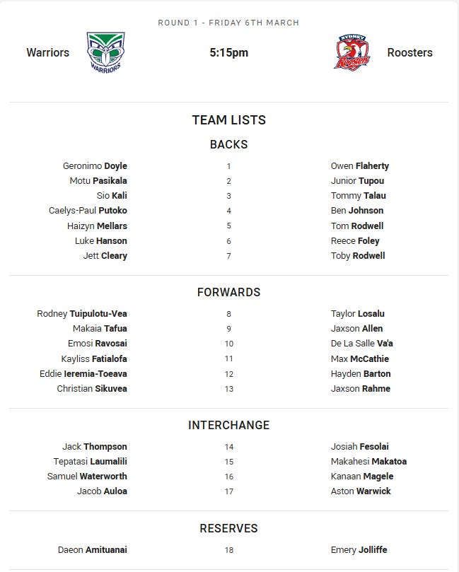 Marata Niukore (calf) was unavailable for selection, allowing Tanner Stowers-Smith to retain a spot in the No.17 jersey. Elsewhere on the bench, Sam Healey earned the No.14 call-up, while Taine Tuaupiki and English recruit Morgan Gannon were both included in the six-man interchange.