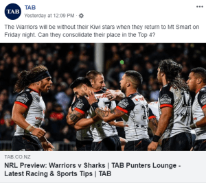 The Punt: NZ TAB Odds – Head to Head: Warriors $1.95, Sharks $1.80 (Line: Warriors +1.5)
