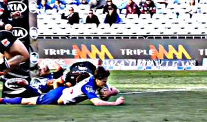 The Bulldogs marched downfield on a Reimis Smith break, and the young winger scored a couple of minutes later when he breezed through a dreadful goal-line tackle from Simon Mannering.