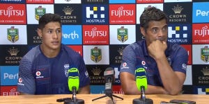 Shaun Johnson and Roger Tuivasa-Sheck were pumped up during their post-game interviews at Optus Stadium after the historic 32-20 victory over South Sydney.